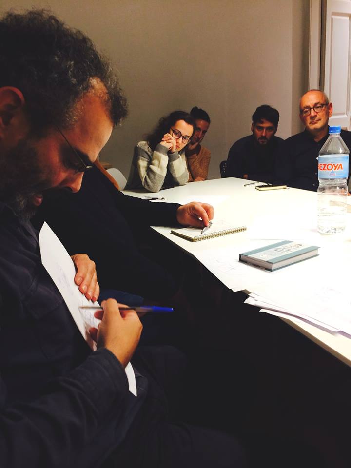 Després d’atendre els mitjans, Gonçalo M. Tavares recupera forces mentre poc a poc van arribant els privilegiats que podran assistir a la primera sessió de treball amb ell a l’escola Bloom. Professors que són a la vegada escriptors, estudiants de literatura de la Universitat de Barcelona, lletraferits disposats a deixar-se amarar per tot aquest univers de l’autor del Viatge a l’Índia, un dels dos texts als quals es poden aplicar els principis recollits en aquestes notes Bloom.