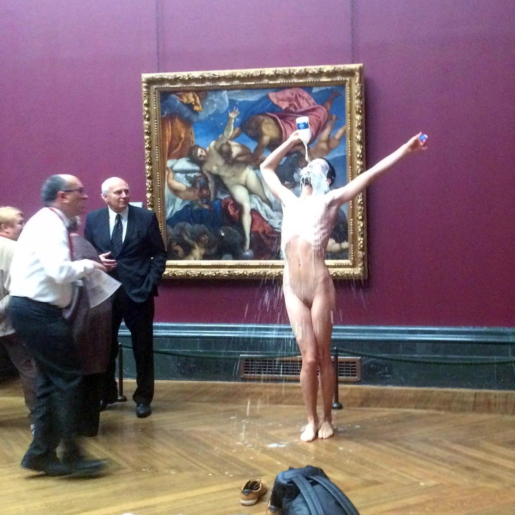 Adrián Pino Olivera explica que el seu ‘Projecte V’ consisteix en “una sèrie de nus artístics en diferents museus d’Europa, al costat d’obres que guarden la forma d’allò femení, una energia que pot transformar aquest món capitalista en decadència”. El seu primer nu va tenir lloc al Museu Uffizi de Florència davant del Naixement de Venus, després fou el torn de la Victòria de Samotràcia del Louvre (París) i, el 22 d’abril, la Fontana di Trevi de Roma. El 22 de maig va ser detingut a la National Gallery de Londres, després de despullar-se i remullar-se amb llet en front del quadre ‘L’origen de la via làctia’. Assegura que seguirà despullant-se pels museus europeus i prepara noves accions durant els propers mesos.