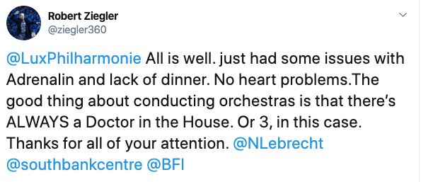 I, de cop i volta, abans d’entrar al cinema, se sent un espetec, un cop fort, brusc, i sec. El director de l’Orchestre Philarmonique de Luxembourg, Robert Ziegler, es desploma. Mig cos queda dins el cadafal, l’altre queda inclinat i en penombra. Els espectadors veuen les cames inertes i rígides, com un arbre de Nadal cap per avall, esperant que el recullin després de les festes. L’orquestra estava interpretant la banda sonora de Bernard Herrmann, per a la pel·lícula Taxi Driver, de Martin Scorsese, que es projectava a la sala gran de la Philarmonie de Luxemburg.