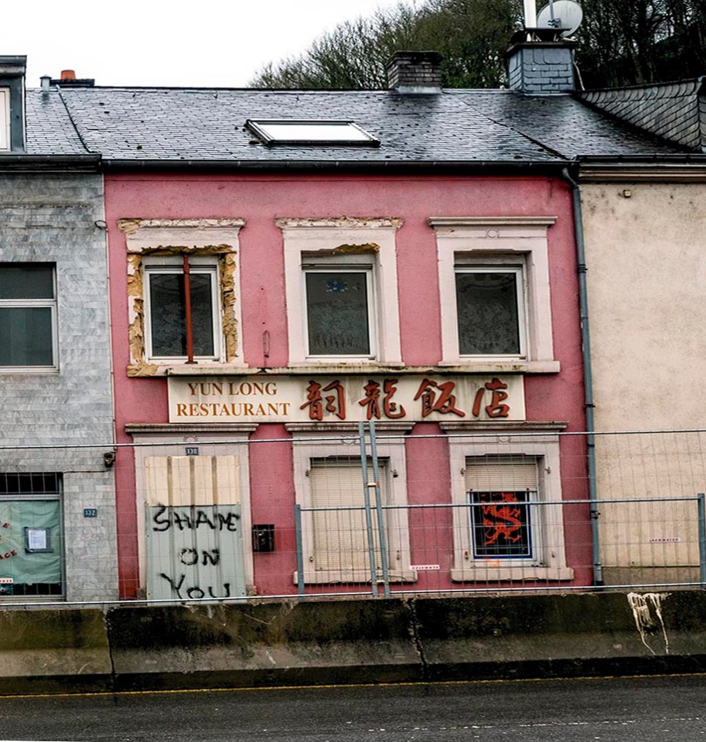 Aquesta fotografia té uns dies. La pintada ‘Shame on you’ (Vergonya) sobre el mur d’un restaurant xinès fa pensar en l’enviament de material mèdic que, dilluns vinent, arribarà a Luxemburg procedent de la Xina. El pic de casos de coronavirus s’espera que passarà en dues setmanes. S’ha construït un hospital de campanya, amb material procedent d’Itàlia.