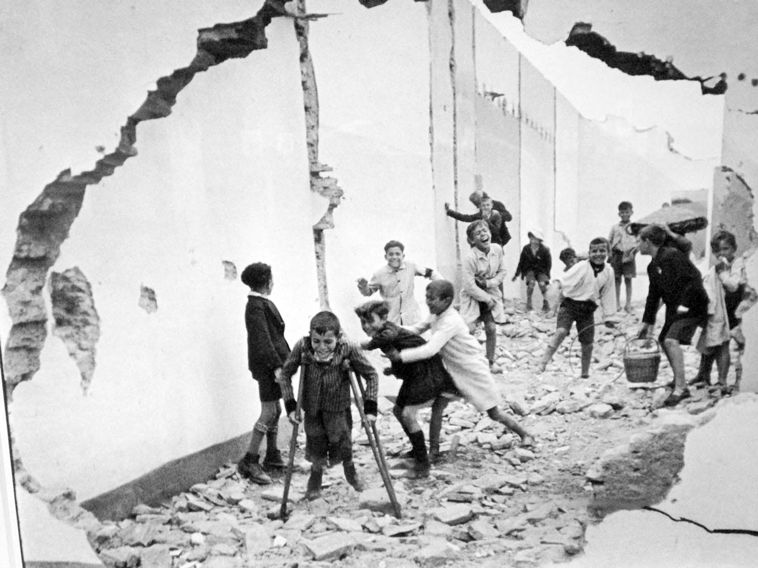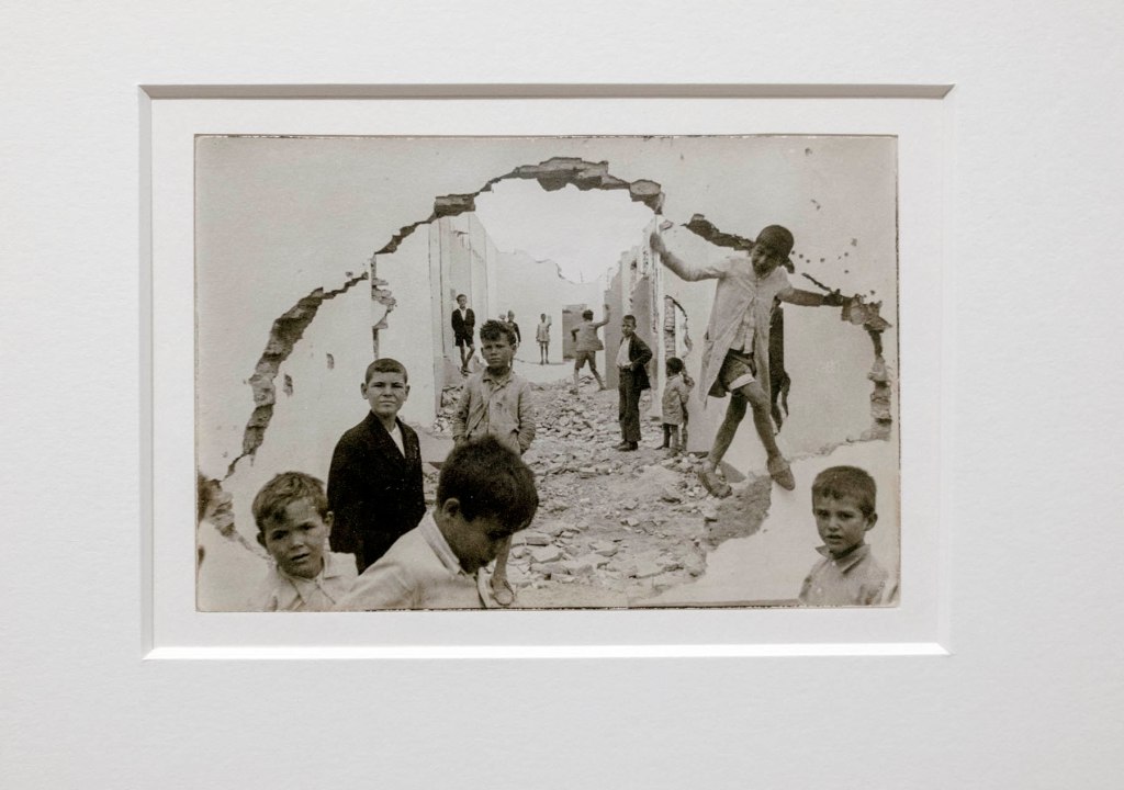 Cada fotografia d’aquesta exposició mereix un comentari, però comencem per una imatge presentada a Llucmajor en una còpia de petit format, del francès Henri Cartier-Bresson. És una imatge a voltes malentesa, perquè s’ha associat sovint a la Guerra Civil Espanyola, però, en canvi, fou feta uns anys abans, el 1933, a Sevilla. S’hi veuen uns nins, enquadrats pel que queda d’un edifici en ruïnes, mig destruït. De tots els joves, només dos nins estan en moviment. La imatge fa pensar en el que viurien aquells al·lots uns anys més tard, retratats per Cartier-Bresson poc abans que tot saltés pels aires a Espanya. Hi ha una imatge també molt coneguda, feta en la mateixa situació, en què es veu en primer pla, un jove amb crosses.